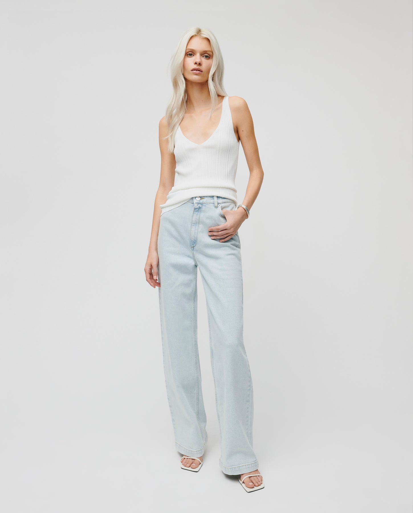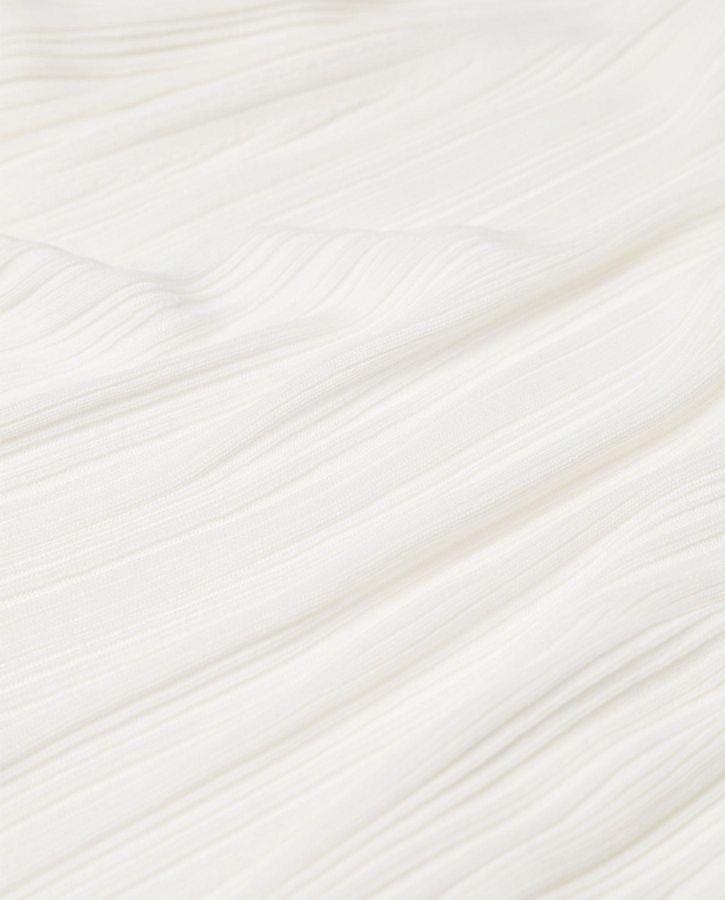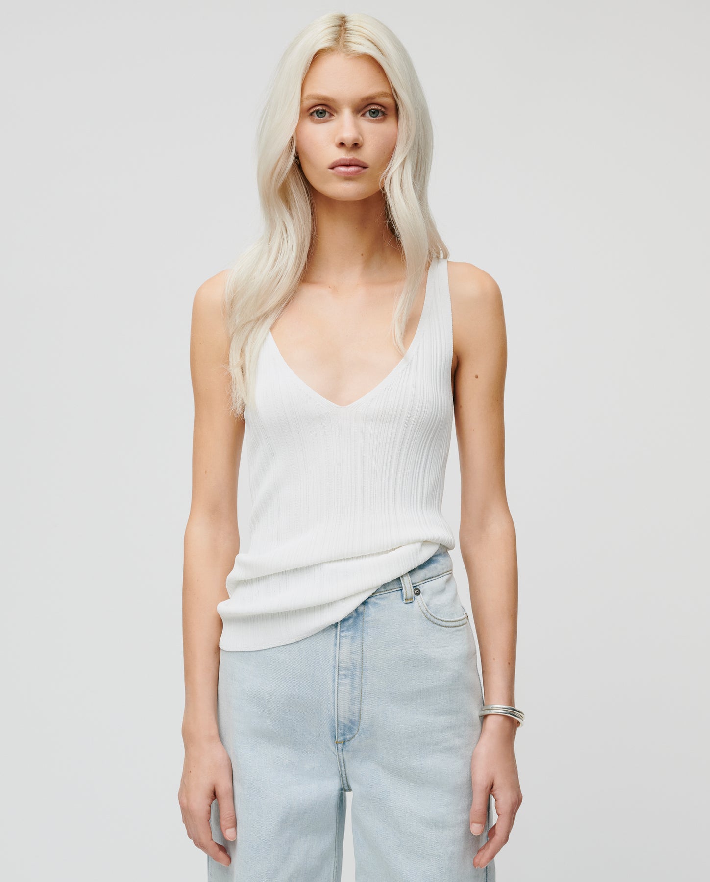 KYM viscose top with irregular knit structure, deep V-neckline in front and back, stretchy due to natural knit characteristic.